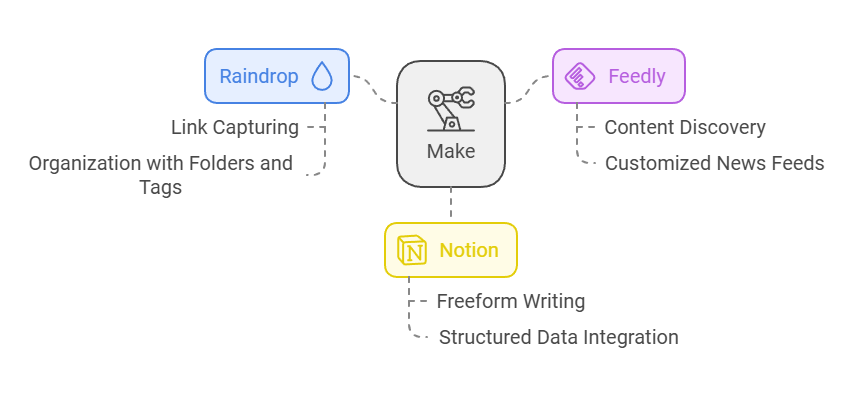 Specific to this case is that they work with Raindrop with is a key tool in the chain. For this publication, Make is used to capture incoming links from Raindrop and Feedly and push them into Notion, streamlining the entire content curation process.